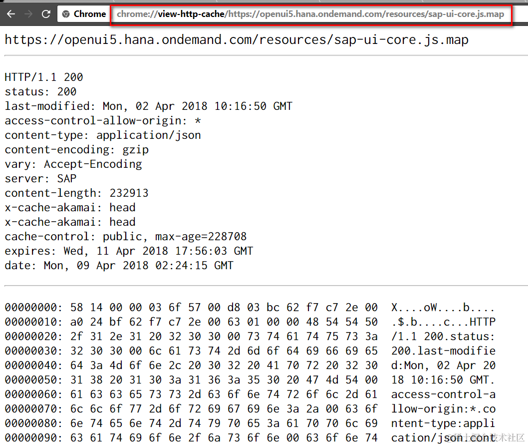 在Chrome里输入”chrome://cache”能看到Chrome本地的所有缓存,从这里我成功找到了文件sap-ui-core.js.map的本地缓存。