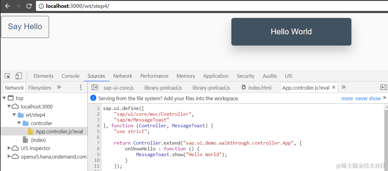 在这篇文章里我用一个简单的UI5应用来研究该机制。这个应用的UI仅仅包含一个Button,点击之后弹出一个Message Toast。