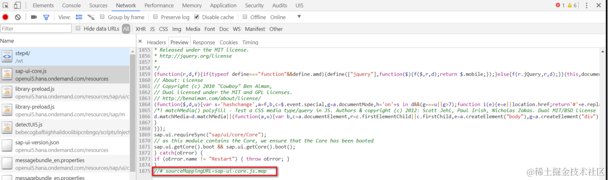 单击sap-ui-core.js,在其最后一行1875行,看到该行内容: