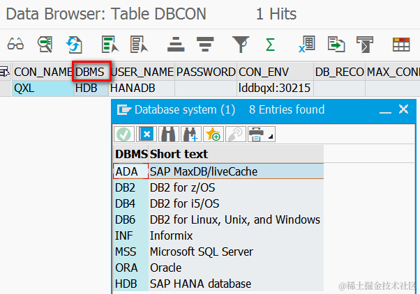 Netweaver 支持的数据库提供商在表DBCON的DBMS字段里能看到: