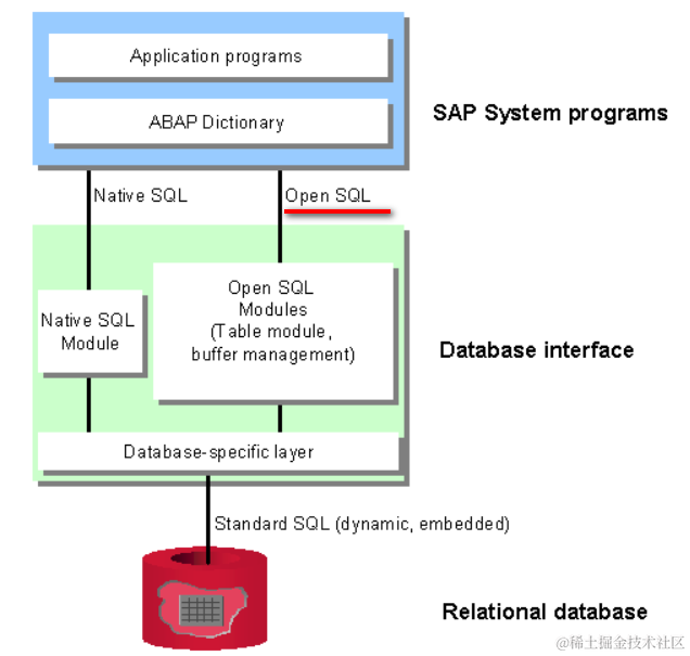 在SAP基于Netweaver的ABAP应用里,应用开发人员用Open SQL访问数据库, 这些Open SQL会被Database interface(数据库接口)转换成各种数据库提供商支持的原生SQL语句然后执行。