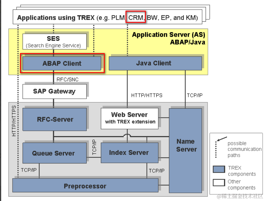 在这两个产品里的Enterprise Search实现原理实际上是应用程序发起一个RFC(Remote Function Call)到TREX服务器上拿到查询结果。