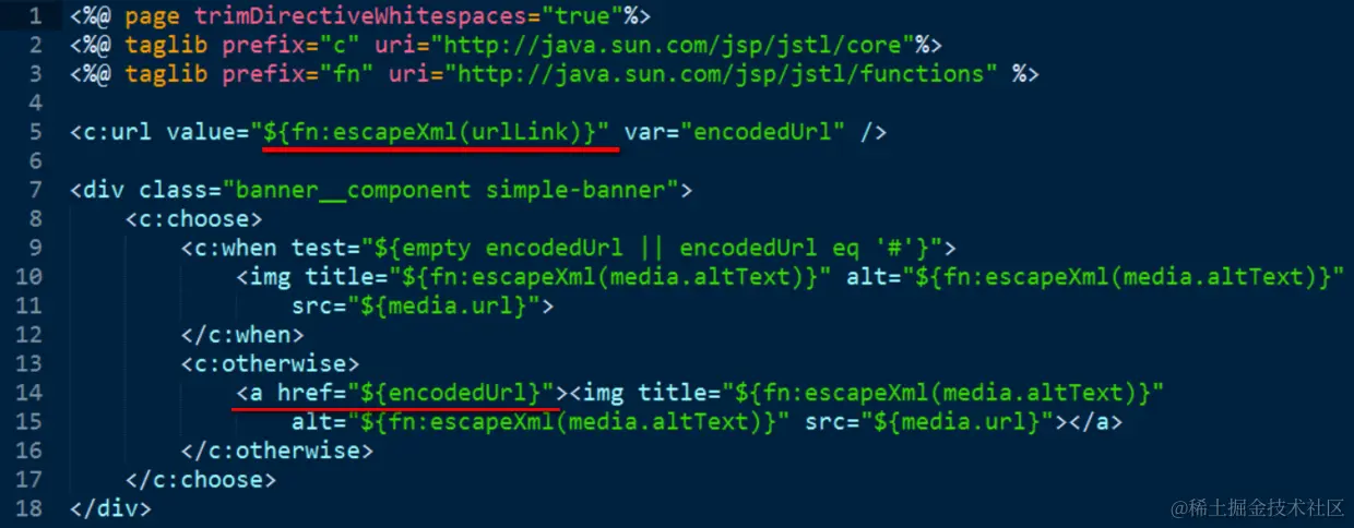 注意看第14行的a标签, 该标签就是最后用户在浏览器里看到的超链接。其href的值来自JSP模型的属性urlLink(在下图第5行指定)。
