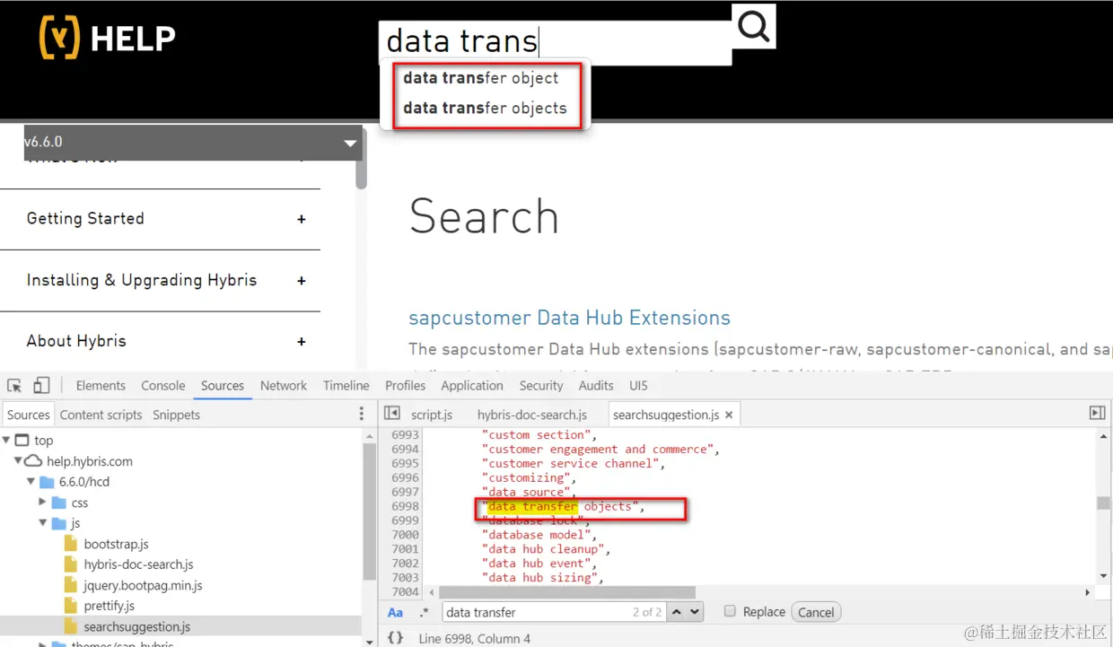 我使用help.hybris.com时,发现每次在搜索栏输入文字时,没有发出任何HTTP请求,那么这个自动完成的下拉框里的记录从哪里来的?我看了下实现,发现所有自动完成下拉框里的记录都是硬编码在searchsuggestion.js里: