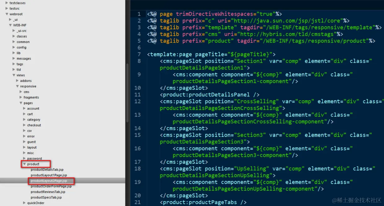 即可找到product明细页面实现的jsp文件完整路径如下:C:\Hybris\6.5.0.0.23546\hybris\bin\ext-template\yacceleratorstorefront\web\webroot\WEB-INF\views\responsive\pages\product\productLayout2Page.jsp:
