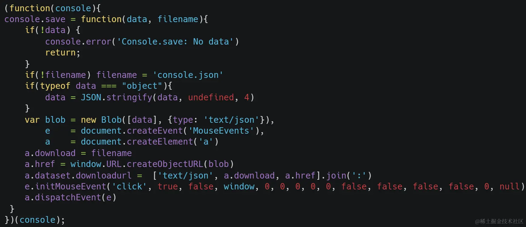 这段代码会给console对象注入一个新方法save, 接下来就能使用console.save(, )将任意变量保存成本地文件,非常方便。