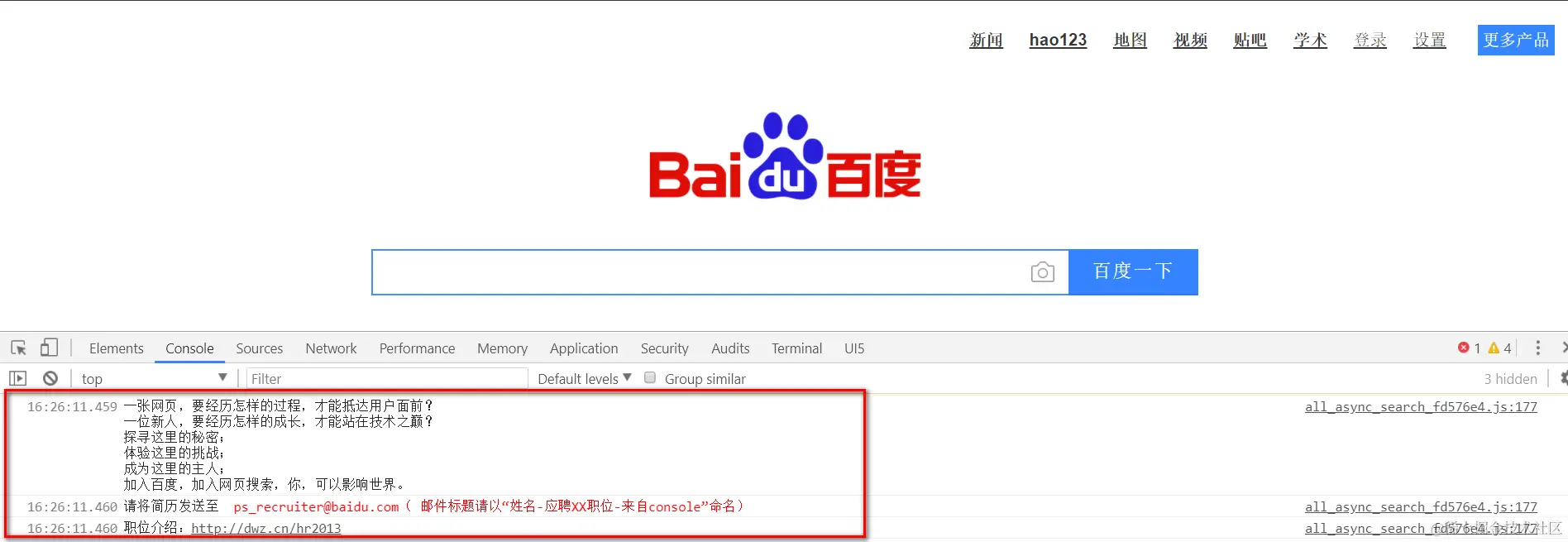用Chrome打开我们常用的网站,按F12,在Console标签页里看到这些信息,这些都是很老的梗了。