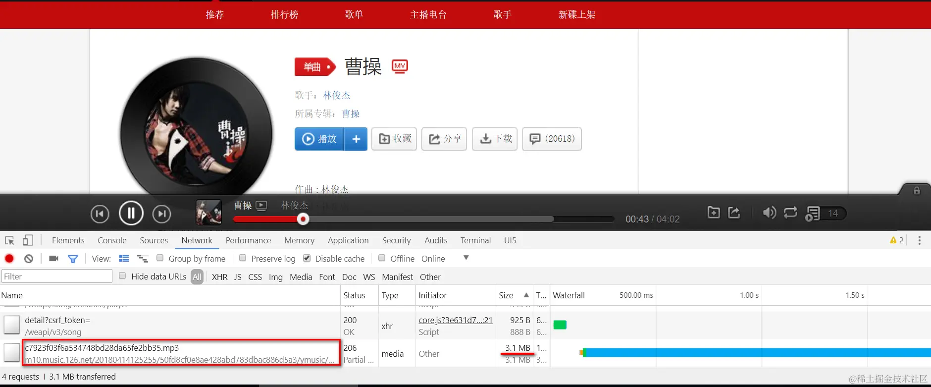 在网易云音乐上听歌,如果想保存到本地,不需要安装客户端,直接在Chrome开发者工具里找到mp3的真实链接即可保存。
