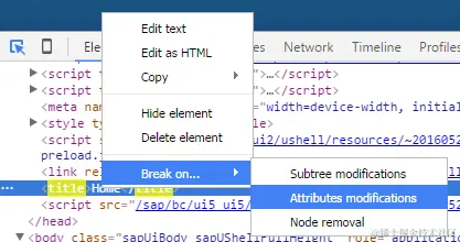 在Element标签页选中某个html标签,在右键菜单里设置Attributes modifications断点。下图意思是一旦title标签的属性发生变化,断点自动触发。