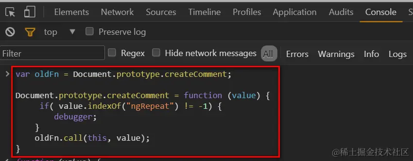 (2) 将浏览器原生的方法实现保存在变量oldFn里,然后重写createComment。在重写的版本里,加上我自己的判断逻辑:我期望只有当创建的comment文本包含ngRepeat时,断点才触发。实现如下图所示。在console里执行下图代码,完成对createComment原始实现的覆盖。