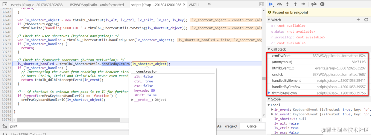 1. 按住ctrl + p之后,会触发WebClient UI框架的按键响应函数thtmlbKeyDown。浏览器传入的事件处理对象里ctrl属性为true,keycode为80(按键p对应的code),意思就是ctrl和p同时按下。