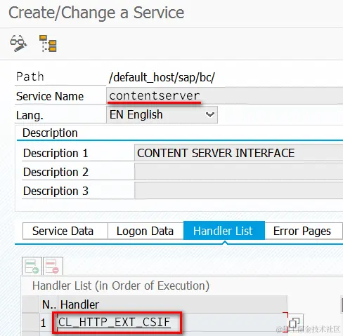 - /sap/bc/contentserver:事务码SICF,Service Name输入contentserver,可以找到这个Service对应的ABAP处理类CL_HTTP_EXT_CSIF。
