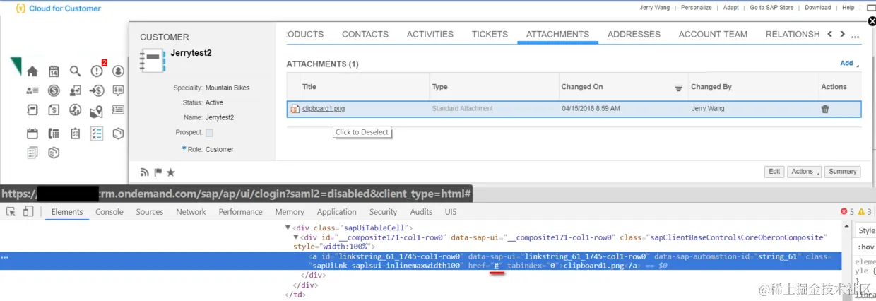 作为一款云产品,用户从浏览器里无法像在SAP CRM那样,能够轻易地查看其服务器端的存储明细。在Chrome开发者工具里看到文件的超链接是一个简单的”#”。