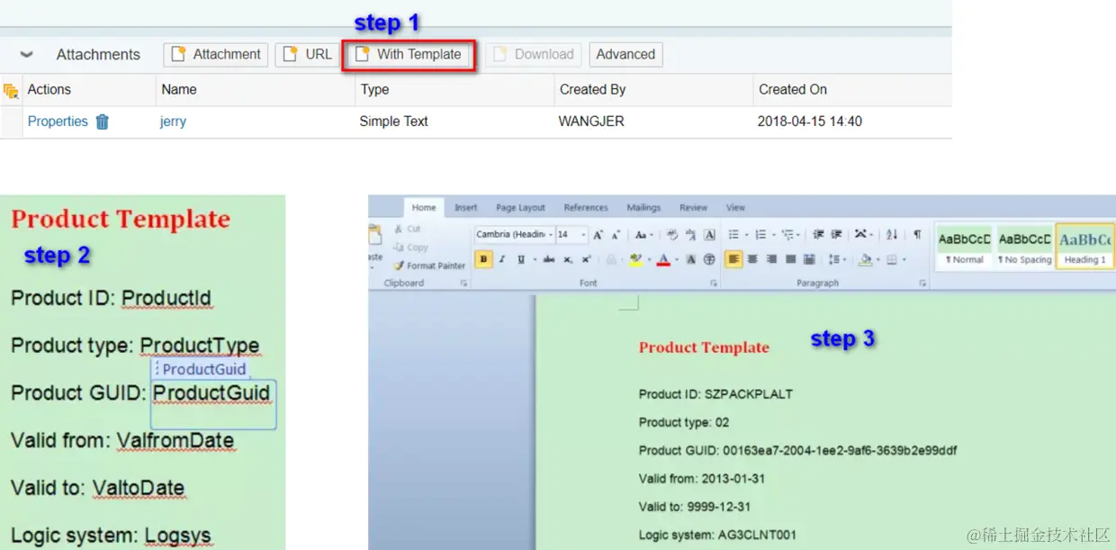 在我的公众号文章SAP S4CRM vs C4C, 诸葛亮和周瑜?里提到SAP CRM内容管理的一个特色功能:用户可以点击下图step 1中的”With Template”按钮,在本地开发一个word模板文件,将里面的字段绑定到CRM标准的BO模型字段上,如下图step 2所示。运行时渲染的word文件里就会显示其从属的业务文档里的对应数据,如图step 3所示。