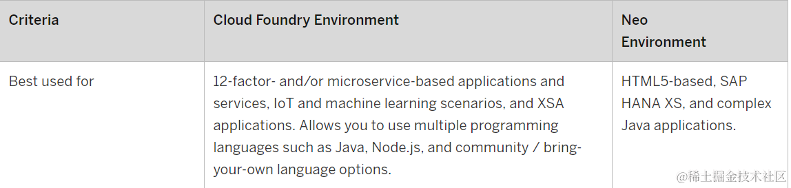 如果当您需要开发基于微服务架构的应用,使用物联网Internet of Things或者机器学习使用场景时,SAP推荐您选择Cloud Foundry运行环境。在Cloud Foundry运行环境下您能使用多种编程模型,例如Java,nodejs和SAP HANA extended application services, advanced model (SAP HANA XSA)。