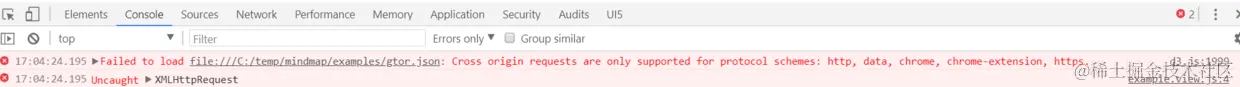 如果直接双击examples文件夹里的index.html文件在浏览器里打开,会出现跨域错误导致本地文件gtor.json无法访问: