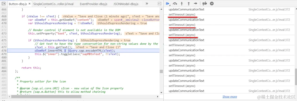 一秒钟之后,断点会自动触发,停留在该元素的innerHTML发生变化的代码位置。从代码478我们得知,UI上按钮的文字能够刷新,是因为其dom元素的innerHTML属性被修改的缘故。