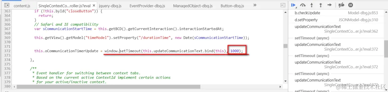 从调用栈也能迅速找到setTimeout的调用位置和调用间隔(1秒)