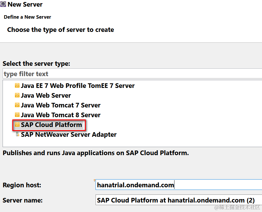 然后新建一个服务器实例,类型为SAP Cloud Platform,主机名填hanatrial.ondemand.com: