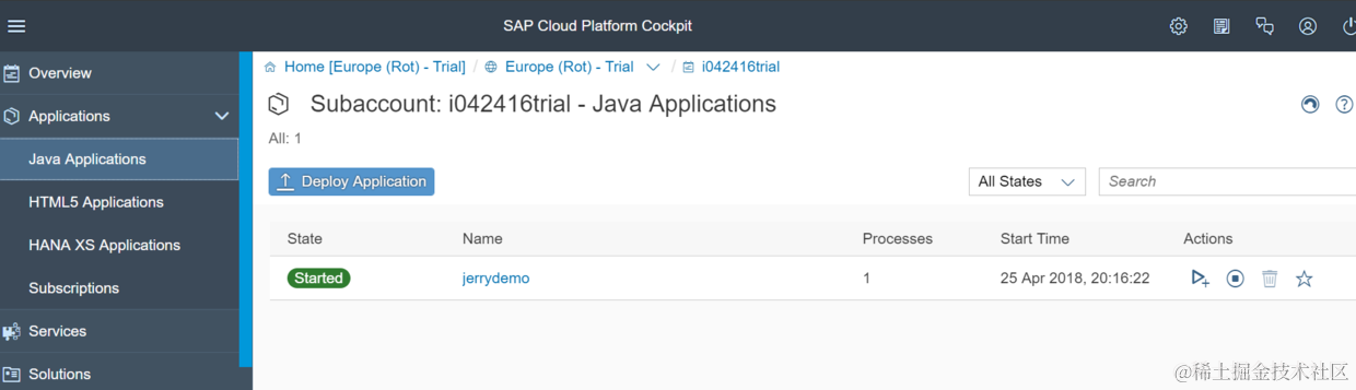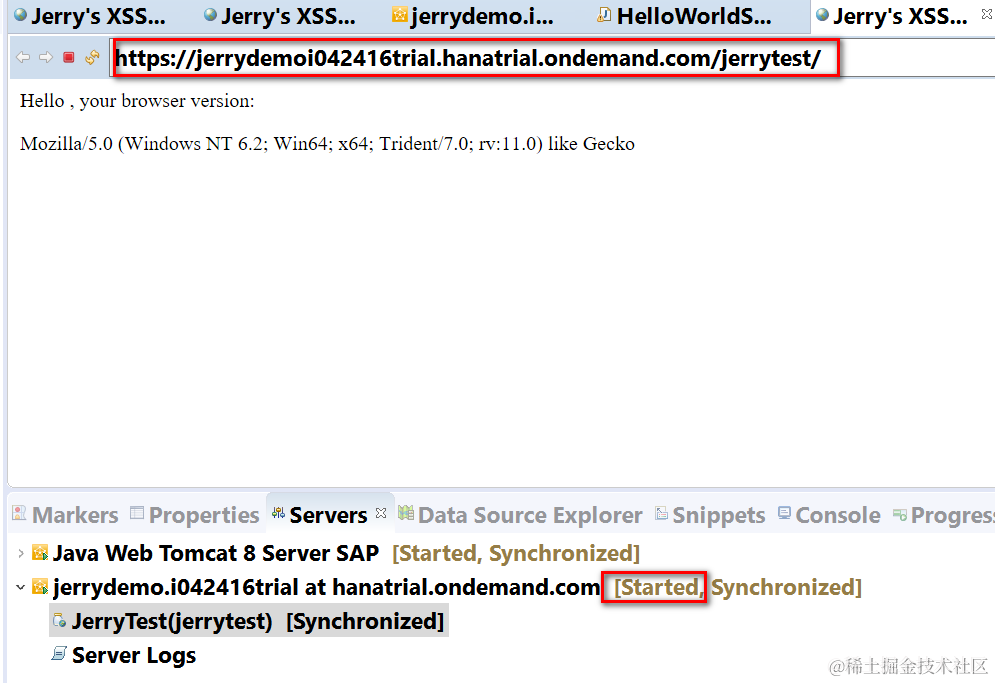 成功之后,即可在Eclipse里看到SAP云平台的实例,jerrydemo这个应用在上面的状态处于Started状态。Eclipse内置的浏览器自动打开该应用。