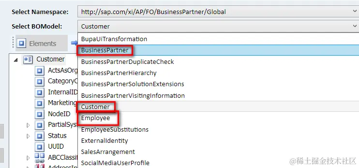这里可以看出C4C的客户模型仍然是一个BO,位于命名空间sap.com/xi/AP/FO/Bu…。