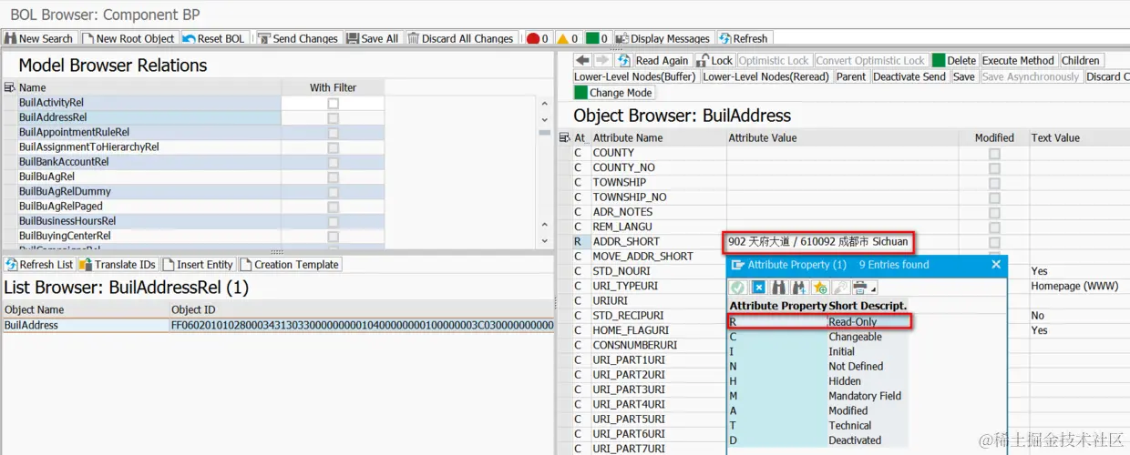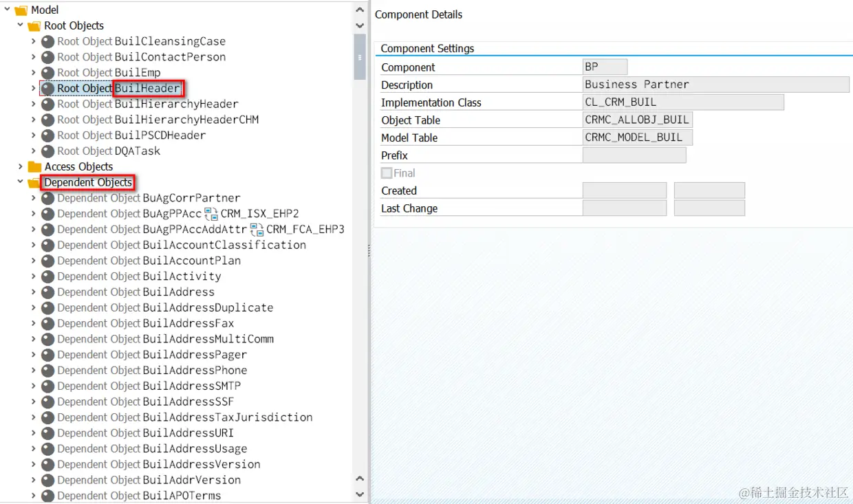 这个BuilAdress节点是SAP CRM客户模型的子节点。SAP很多产品都有所谓Business Object(下文简称BO)的概念,这些模型从技术上来说是一棵树,由若干节点组成,节点与节点之间存在父子关系或者跳转关系。每个节点由若干字段组成,这些节点组成的模型,再加上节点上定义的一系列能够执行的动作(action)就构成了一个BO,实际上是sap对某一业务流程及参与实体的高度抽象的产物。