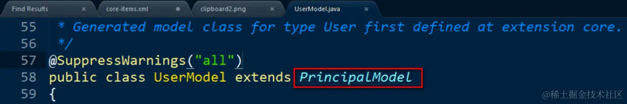 而User模型的实现文件UserModel.java和CustomeModel.java位于同一个文件夹。打开UserModel.java, 发现它又是扩展自模型PrincipalModel。