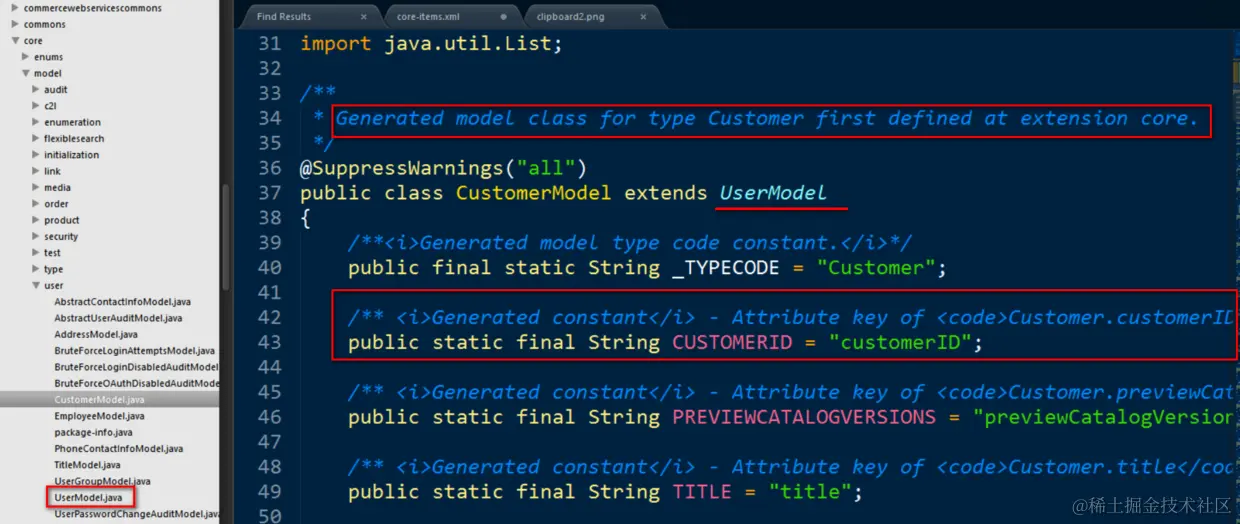 查看CustomerModel.java,发现xml文件第1757行定义的code Customer出现在了Java文件的第40行,xml文件第1763行为Customer模型定义的新字段customerID, 出现在Java文件的第43行。