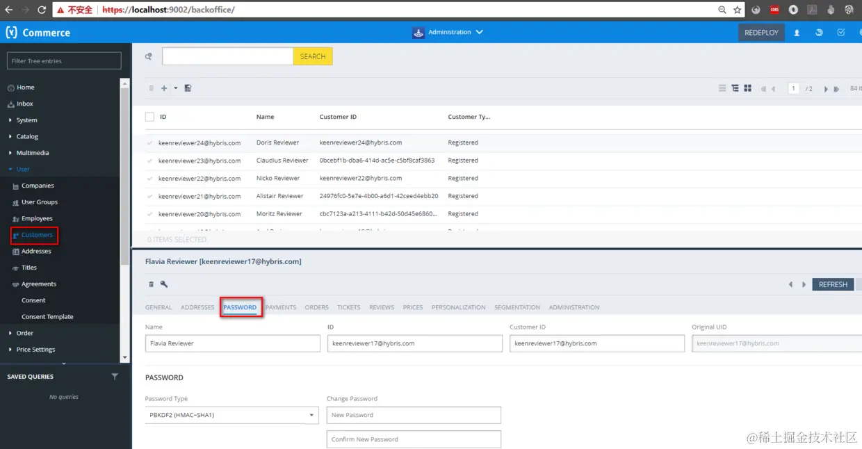 Hybris ECP backoffice里也存在Customer和Employee模型。因为是backoffice的使用场景,所以和前文介绍的SAP CRM和SAP C4C不同,这里的客户页面还包含一些其他维度的信息维护,比如密码策略和密码重置功能。