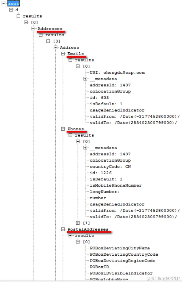 在Chrome开发者工具里展开节点即可查看该节点的字段。例如地址节点包含的字段如下: