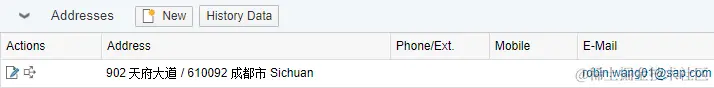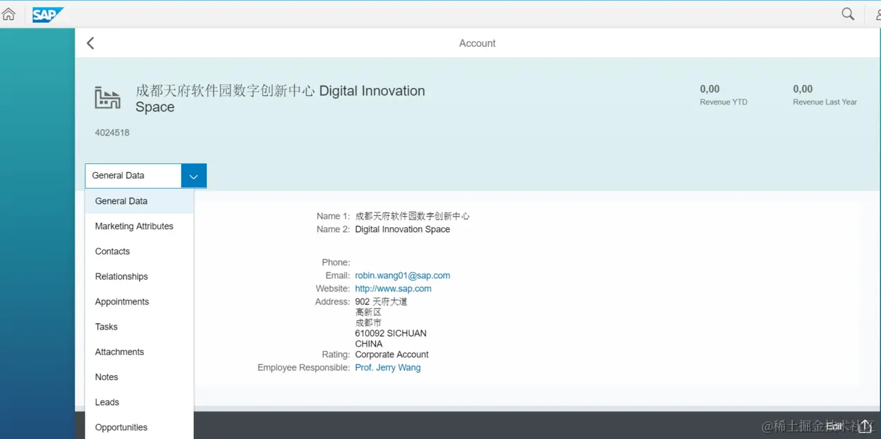 可以看出CRM Fiori和CRM UI显示的思路类似,都是把抬头类型的信息和各个维度的明细信息分开显示。同CRM相比,稍稍不同的是CRM Fiori的客户明细页面并不像CRM那样,各个维度的数据从上到下依次全部显示在一个页面上。因为要照顾到使用平板电脑或者手机访问系统的Fiori用户,所以CRM Fiori页面上只会显示某一维度的客户数据。不同维度的数据展示通过下拉菜单来切换。