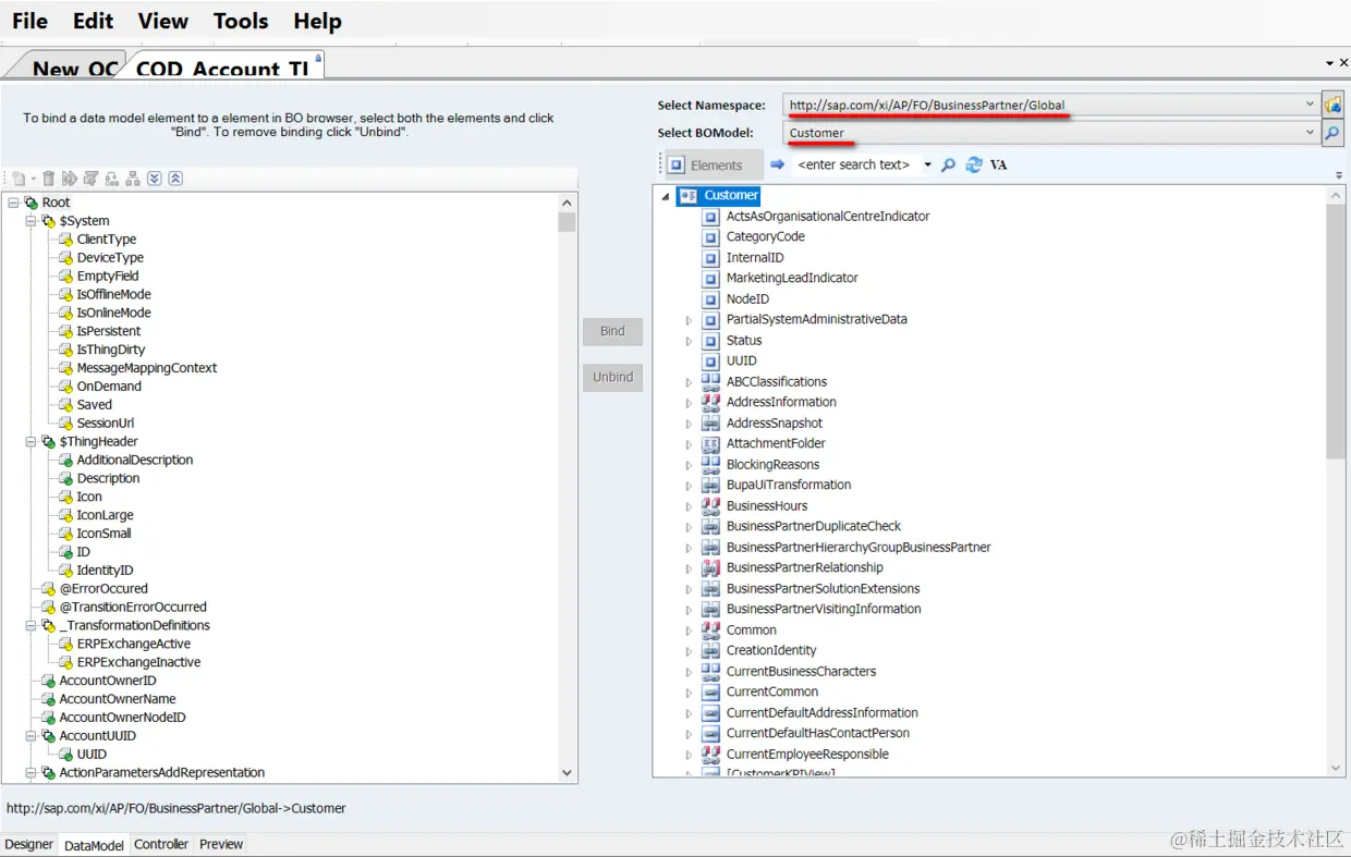 在Cloud Application Studio里打开该UI模型,点击Data Model即可查看C4C客户模型的设计明细。