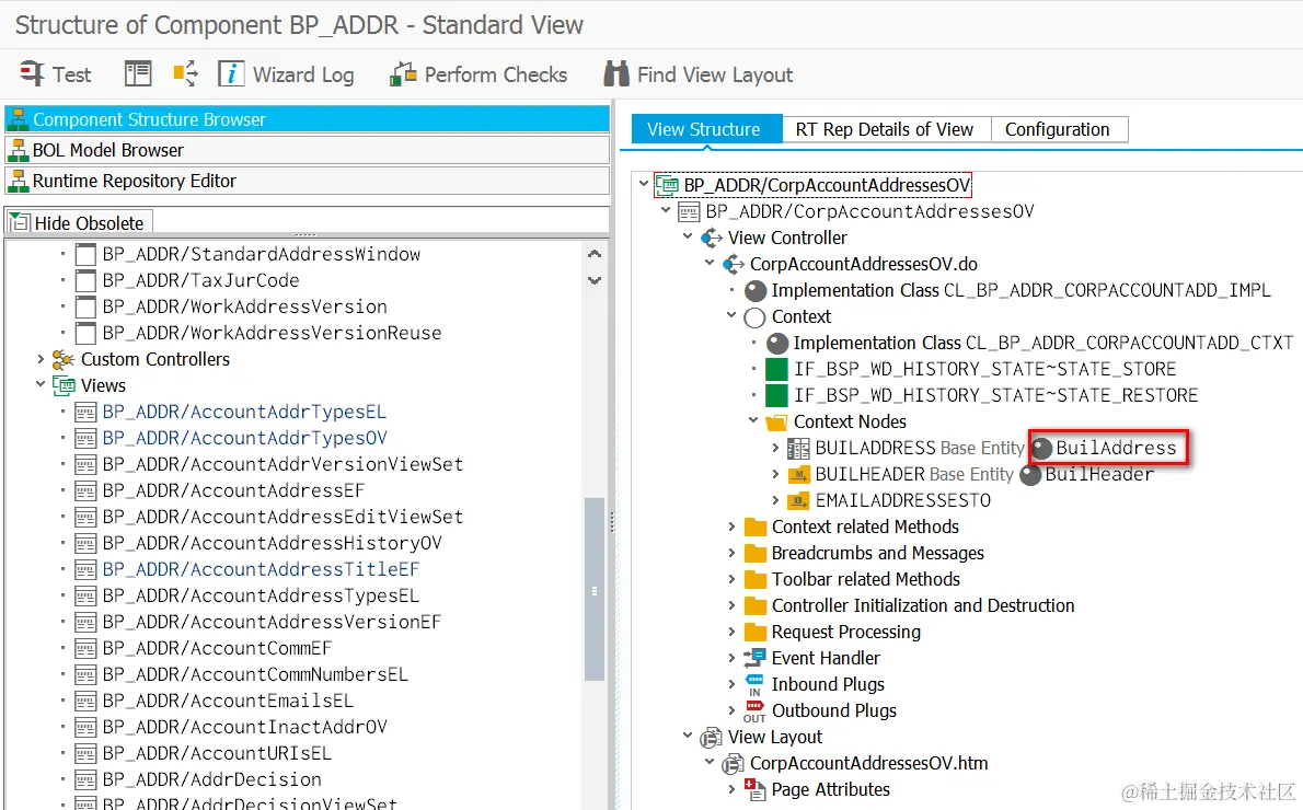 假设我想深究下图名为Address的Assignment block实现明细,在上图中得知其BSP实现为BP_ADDR/CorpAccountAddresses。在开发工具里打开此视图,找到地址数据是来自模型节点BuilAddress。