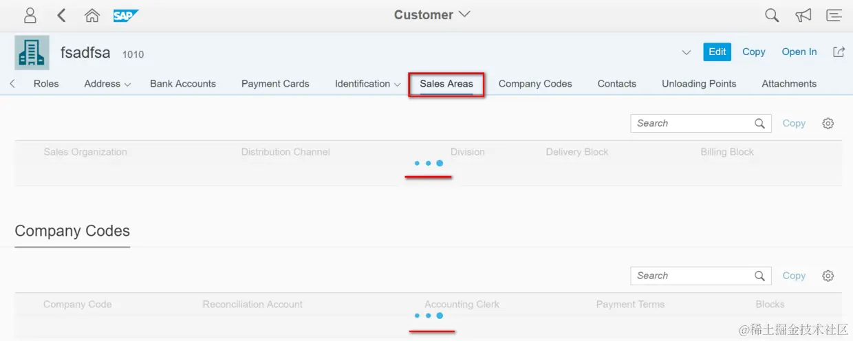 客户明细页面的抬头区域下部由若干可以通过点击小三角符号来展开的区域组成。SAP的技术文档里称这些区域为Assignment Block。
