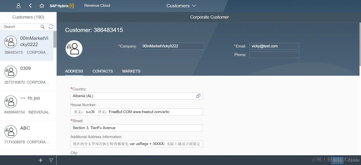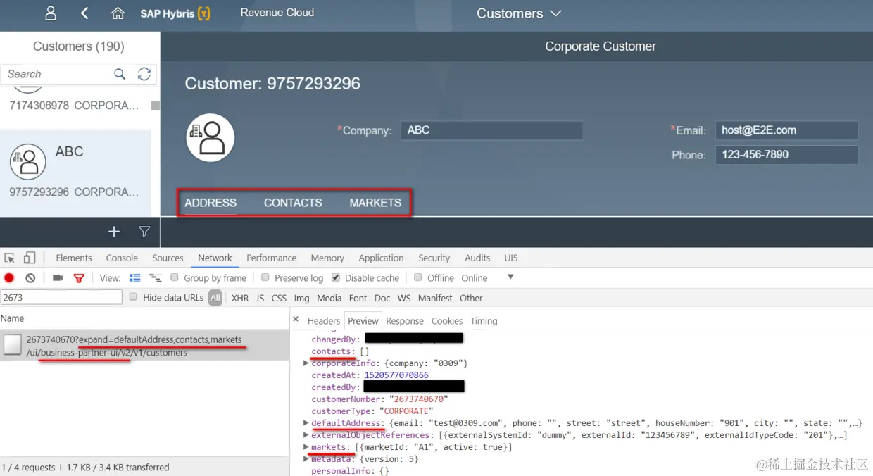 选中Master List里某个客户,会触发另一个HTTP请求向后台读取选中客户的明细:分别是客户地址,客户联系人和客户市场信息。这三类明细分别是Revenue Cloud客户模型的三个子节点,通过expand指令读取。