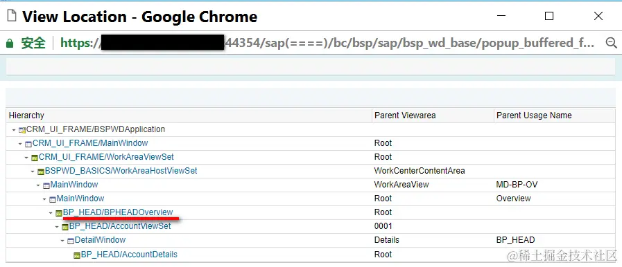 如何查看SAP CRM的客户模型呢?在上图客户页面按F2,会显示如下弹出窗口,显示该页面实现的BSP应用视图名称为BP_HEAD/BPHEADOverview。