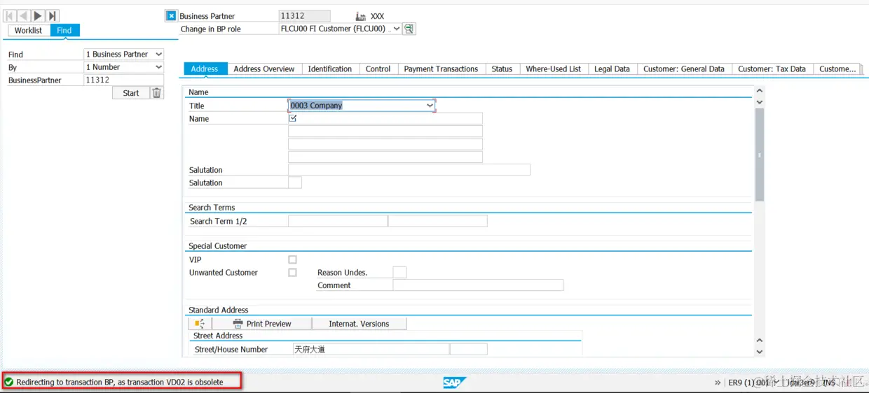 客户数据的创建也统一使用事务码BP来完成。R/3那些五花八门的业务伙伴创建的事务码全部标注成Obsolete。一旦执行,会自动重定向到事务码BP去。