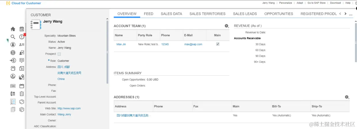页面风格和SAP CRM稍有不同,但是思路一致:客户的抬头信息显示在页面左部,其他维度的信息显示在页面右部。每个维度的信息通过不同的标签页进行切换。