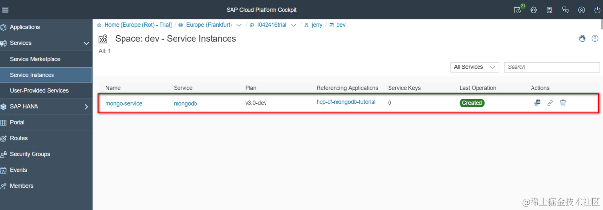 首先按照我这篇文章在SAP云平台上给您的账号分配MongboDB服务:如何在SAP云平台的Cloud Foundry环境下添加新的Service
