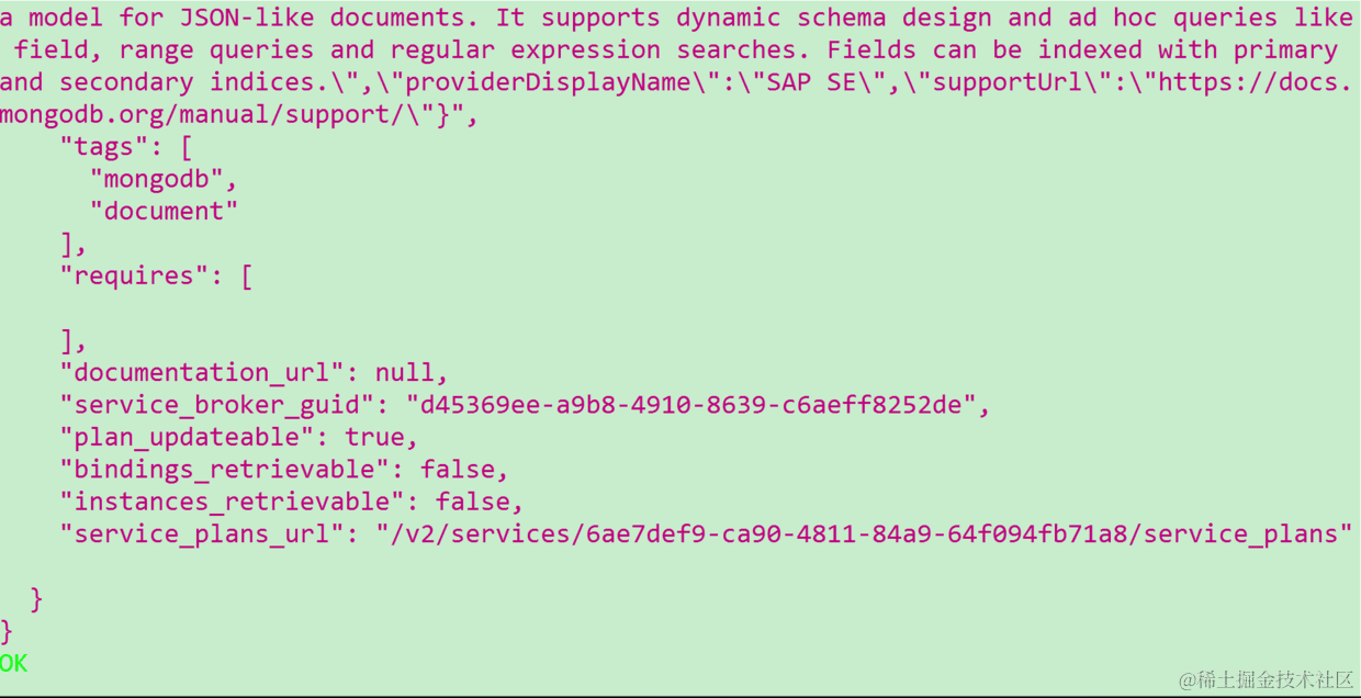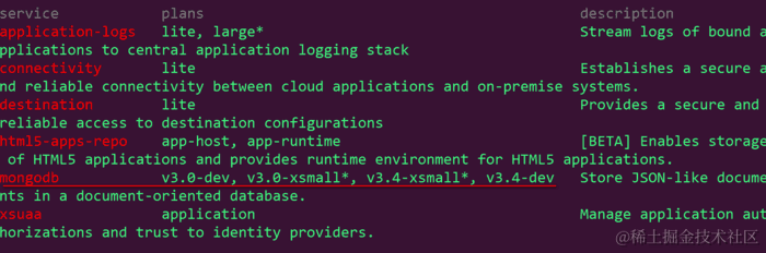 1. 使用命令行 cf marketplace查看当前SAP云平台的MongoDB的版本号:在我使用的SAP云平台上是v3.0-dev