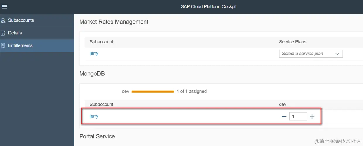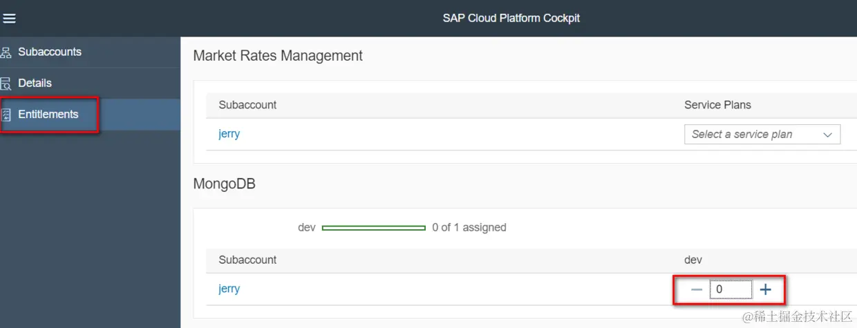 退回到Global Account,点击Entitlement,发现没有给Subaccount分配MongoDB: