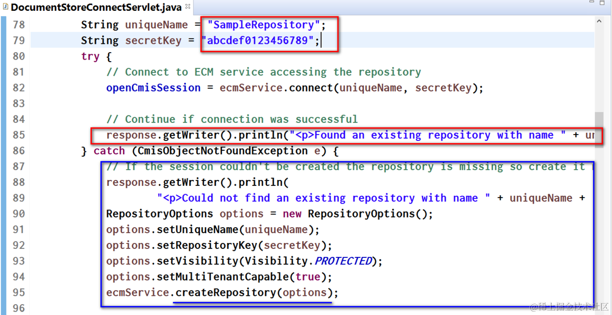 第一次点击Connect时,会执行下图catch分支的代码,用硬编码的密匙创建一个新的repository。第二次执行即进入第85行逻辑,因此此时repository已经存在。