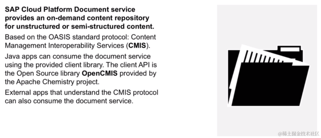 SAP云平台以微服务的方式提供了Document的CRUD(增删改查)操作。该微服务基于标准的CMIS协议(Content Management Interoperability Service)。