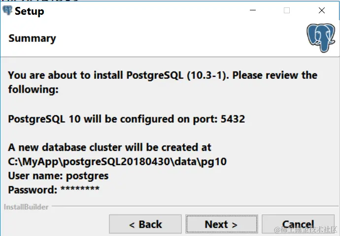 安装时,请记住您给user postgres设置的初始密码,以及默认端口号5432,后面需要使用。