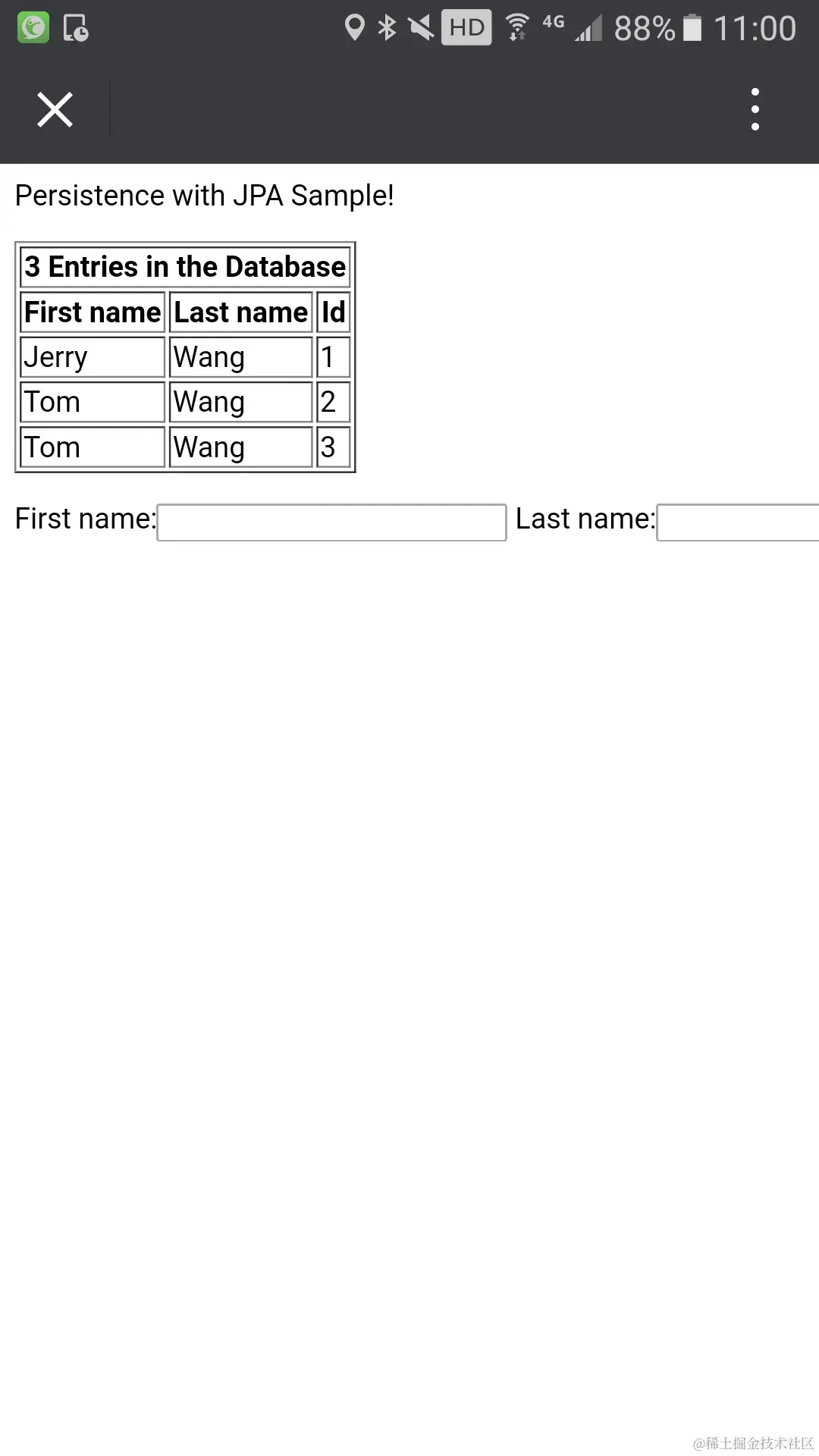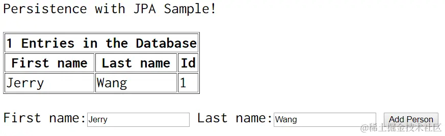 在PC浏览器里测试。这个hello world的JPA应用只设计了一张表,包含First Name和Last Name两列。
