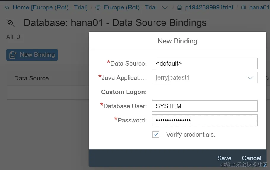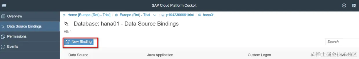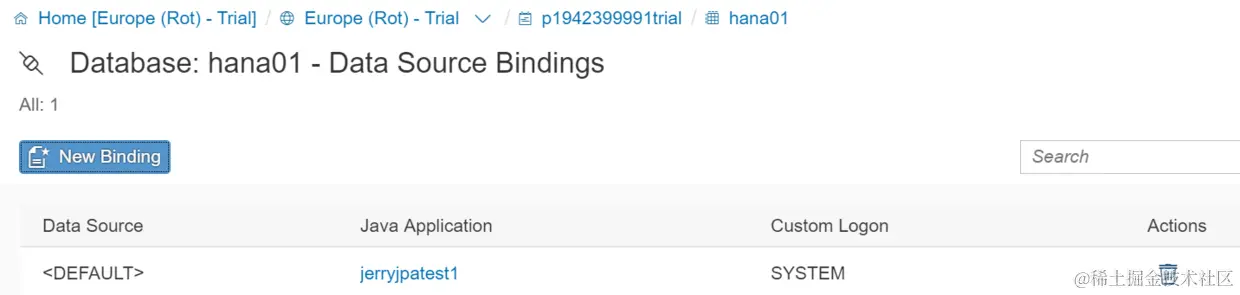 3. 将部署完成的Java应用与第一步创建的HANA DB实例进行绑定: