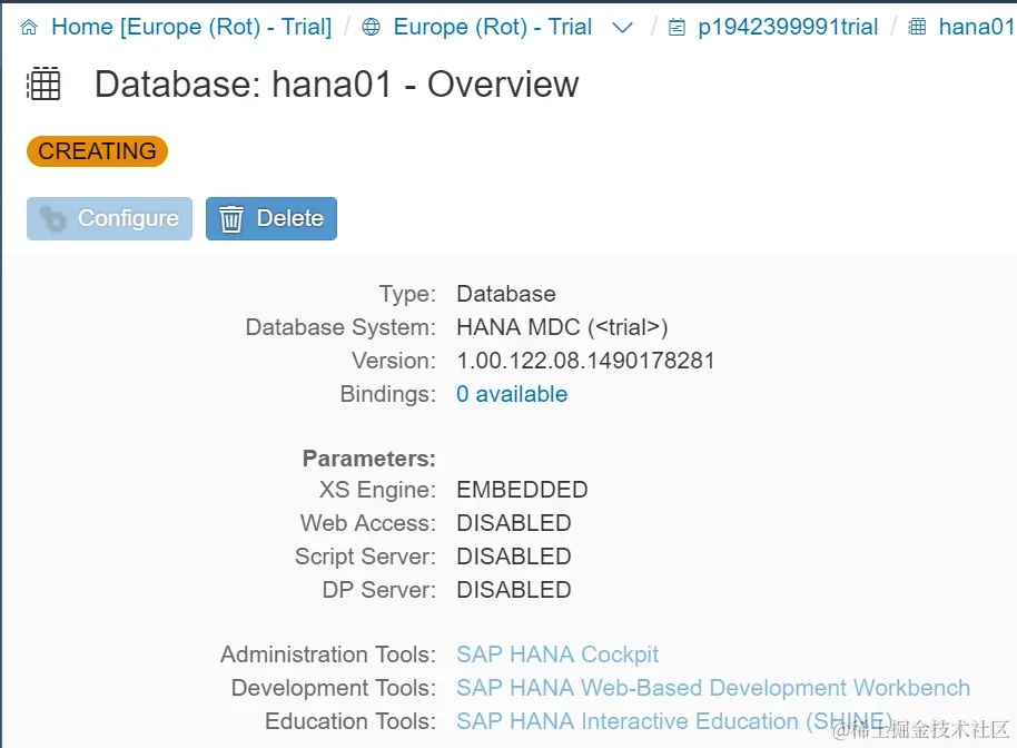 创建成功后,HANA DB实例状态为CREATING: