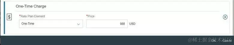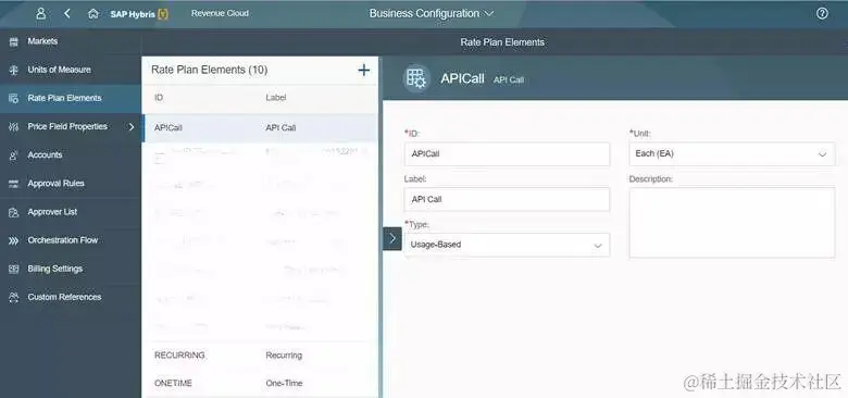 用已创建的单位EA来定义一个类型为基于客户使用的计费元素,ID为APICall。以及一次性和按月收费元素ONETIME,RECURRING: