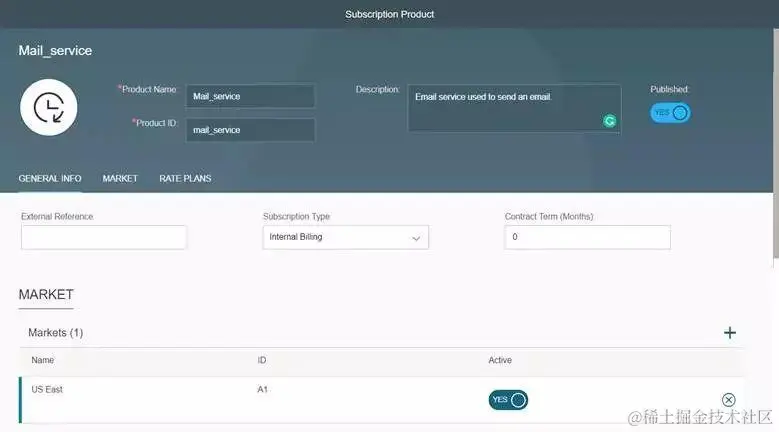 客户创建完成后,接着维护产品信息,可以创建订阅型产品或者组合式产品。如图创建一个订阅式产品Mail_service,指定Market到US East,并创建对应的价格信息RatePlans。指定产品的账单生成日期于每月订阅日期,订阅该产品一次性费用为988美元,按月费用为50美元,同时产品包含1000次APICall,每超过100次收费20美元。