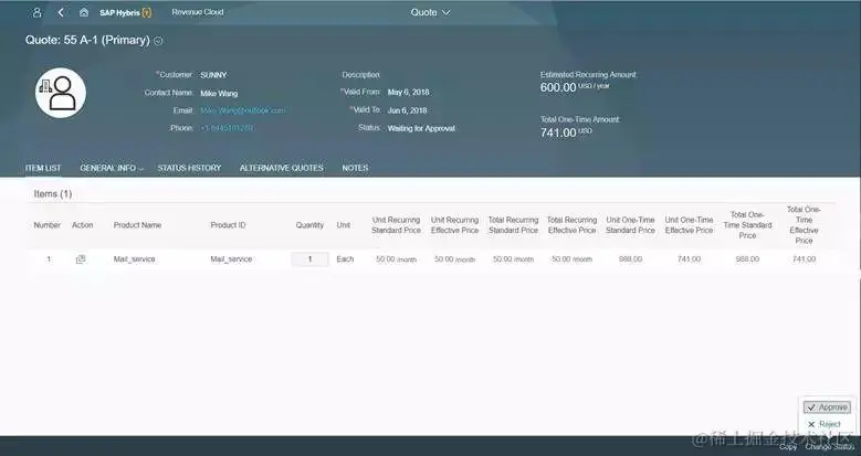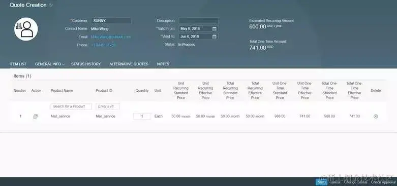 主数据创建成功后,便可以在US East Market中对客户SUNNY创建Mail_Service的报价单,并给产品的一次性费用25%的折扣,同时指定报价单的有效日期以及产品的订阅有效起始日期。